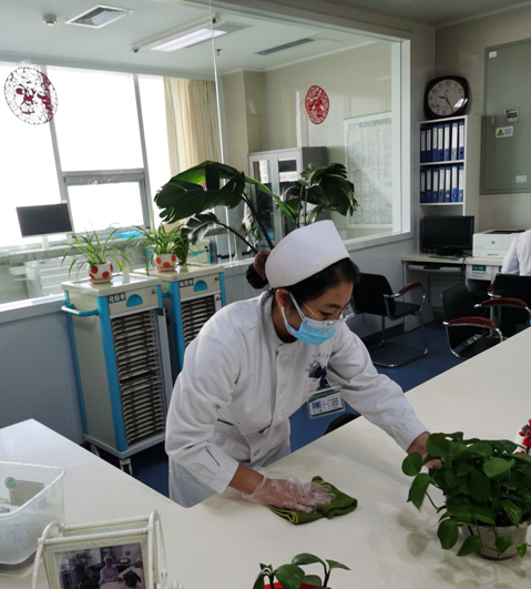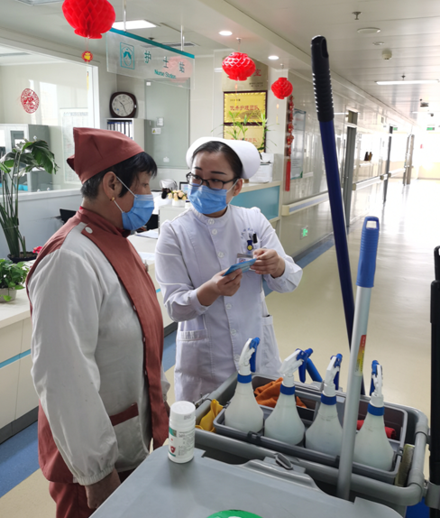 每天固定班次用高效含氯消毒劑擦拭值班室門(mén)把手、工作區(qū)域等醫(yī)務(wù)人員常接觸的物品、環(huán)境,不把病毒帶出醫(yī)院,時(shí)刻牢記要堅(jiān)守最后一道防線。